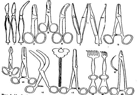 Необходимый набор инструментов: скальпели: 1 - брюшистый, 2 - остроконечный, 3 - герниотом; ножницы: 4 - прямые тупоконечные, 5 - прямые остроконечные, б - Купера; пинцеты: 7-анатомический, 8 - хирургический, 9 - большой Пеана, 10 - малый Пеана, 11 - Кохера; жомы кишечные: 12 - изогнутый Дуайена, 13 - прямой Кохера; 14 - желобоватый зонд; раневые крючки: 15 - тупой зубчатый, 16 - острый зубчатый; 17 - игла хирургическая изогнутая; 18 - иглодержатель Гегара.