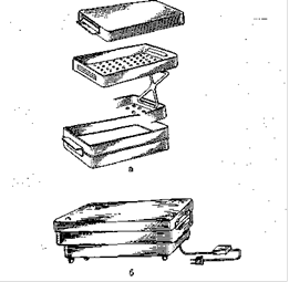 Для стерилизации инструментов кипячением применяют простые или электрические стерилизаторы, имеющие съемную решетку с ручками. Стерилизацию проводят в обычной воде с добавлением щелочей: 1 % натрия карбоната; 3% натрия тетрабората (бура), 0,1% едкого натра. Продолжительность кипячения зависит от растворенной в воде щелочи: с натрия карбонатом - 15 мин, с бурой - 20, с едким натром - 10 мин. Щелочи предупреждают коррозию металла, усиливают эффективность стерилизации и сокращают время кипячения.