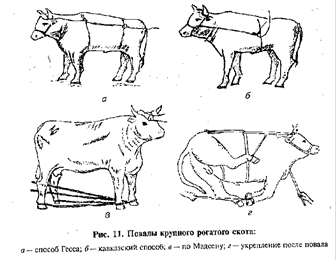 Повал одной веревкой по Гессу. Веревку длиной 8-10 м закрепляют одним концом на рогах (у комолых животных привязывают к недоуздку), а затем опоясывают ею грудь и живот. Потягиванием веревки за свободный конец сдавливают грудную и брюшную стенки, что вынуждает животное лечь. Чтобы повал произошел на желаемую сторону, животное подталкивают, упираясь в соответствующий маклок, или тянут его в сторону повала за хвост. После повала связывают ноги животного.