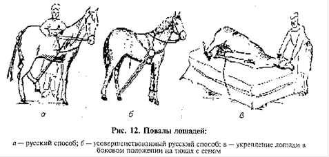 Русский способ. Для повала необходим прочный ремень длиной 8-10 м. К одному концу его при помощи металлического кольца диаметром 8-12 см наглухо пришивают ременную петлю для шеи. В продаже имеются стандартные (ременные, капроновые) повальные ремни. Ремень надевают на шею так, чтобы кольцо находилось в области локтевого бугра стороны, противоположной повалу. Свободный конец ремня направляют назад, охватывают им путовую область тазовой конечности стороны повала. Затем ремень снова пропускают через кольцо и перебрасывают через холку. Фиксирующий становится на сторону повала и удерживает одной рукой повальный ремень, подтягивая как можно выше тазовую конечность, а второй - повод уздечки, поворачивая голову лошади в сторону, противоположную повалу. Лошадь теряет равновесие и мягко опускается на землю или мягкую подстилку. После повала лошадь прочно удерживают, оттягивая назад голову, и связывают конечности.