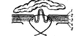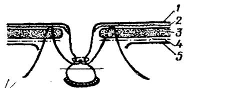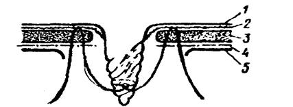 Оперативное лечение вправимой пупочной грыжи способом Геринга-Седамгродского: 1 - брюшина; 2 - поперечная фасция 3 - мышечно-апоневротический слой; 4 - желтая брюшная фасция; 5 - кожа