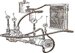 Очищают узлы и детали ГСТ, прилегающую поверхность от загрязнений, предотвращают попадание посторонних частиц во внутреннюю полость агрегата. Остановив двигатель, разгружают гидропривод, устанавливают рычаг понижающего редуктора в нейтральное положение и для снятия давления в системе ослабляют крышку бака. Затем вывертывают пробки и подключат манометры (рис. 1). Запустив двигатель, прогревают рабочую жидкость до 50 °С. При проверке надежно затормаживают машину.