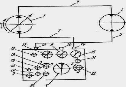 1 — гидронасос; 2, 4 — шланги высокого давления; 3— счетчик жидкости; 6, 13, 15— манометр; 9— секундомер; 10, 12, 14 — штуцера; 16—указатель температуры; 18 — маховичок дросселя; 19 — кнопка золотника включения диафрагмы; 20 — пробка клапана предохранительного; 21 — кнопка сброса показаний счетчика жидкости; 22 — маховичок вентиля; 23—кнопка сброса показаний секундомера; 24—кнопка золотника распределителя.