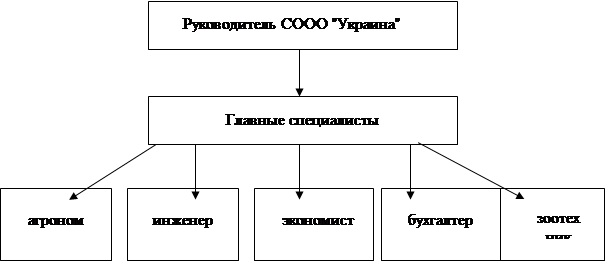 До реформирования хозяйство располагало лесами и садами, а потом все было передано государству. После реформирования бывшего КСП "Радянська Украина" руководящий состав и главные специалисты в СООО "Украина" не изменялись. Схематически структуру управленческого персонала можно представить следующим образом.