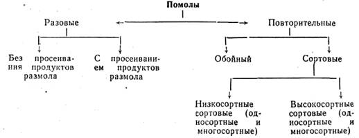 Для получения муки, соответствующей требованиям государственного нормирования, и в количествах, отвечающих выходам, применяют различные виды помолов с использованием разнообразных машин различной производительности, последовательно связанных между собой. Поэтому помолом называют совокупность процессов и операций, проводимых с зерном и образующимися при его измельчении промежуточными продуктами. Схемы помолов, характеризующие взаимосвязь машин и движение продуктов, принято изображать графически. Степень сложности схем зависит от вида помола и производительности мельницы. Чем проще ведется измельчение зерна, тёк проще и схема помола.