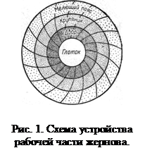 Все помолы подразделяют на разовые и повторительные (см. схему). Первые названы так потому, что превращение зерна в муку совершается после однократного его пропуска через измельчающий механизм или машину. К машинам такого типа относятся жерновые постава и дробилки (например, молотковые). При этом измельчающие органы (например, жернова) должны быть размещены один от другого на таком близком расстоянии, чтобы зерно за время прохождения от центра жерновов к их окружности было полностью растерто до состояния муки. Этому способствуют насеченные на рабочей части жерновов по определенным правилам бороздки глубиной 7—12 мм. Один из жерновов, сделанных из естественного или искусственного камня, закрепляется неподвижно (лежень), а второй (бегунок) вращается с окружной скоростью 10—12 м/с. Зерно засыпается в глоток (рис. 1) и при вращении бегунка затягивается в пространство между жерновами.