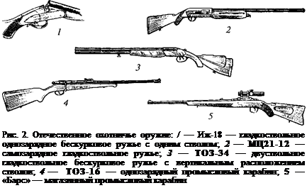 Охотничье огнестрельное оружие делят на три основные группы: гладкоствольное, нарезное и комбинированное. Наибольшим распространением у охотников пользуются гладкоствольные, или дробовые, ружья, которые обеспечивают возможность отстрела как неподвижной, так и бегущей или летящей дичи любых размеров в пределах 50 — 70 шагов, что считается нормальной убойной дистанцией. Нарезное оружие — винтовки, карабины и штуцеры — не столь универсально. Это оружие предназначено для очень точной стрельбы на расстояниях до 500 м по неподвижным или медленно перемещающимся объектам. Как правило, нарезное оружие применяют при отстреле крупных и средних животных, к которым трудно приблизиться. Комбинированные ружья — двойники или бокфлинты, трехстволки и четырехстволки — совмещают возможности и гладкоствольного, и нарезного оружия, несколько уступая последнему в точности при стрельбе на дальние расстояния. Это оружие специального назначения, и охотники его редко заводят как единственное ружье. При наличии одного нарезного и одного дробового ствола охотник лишен возможности мгновенно произвести два последовательных выстрела по быстродвижущей-ся цели. А тройники, и особенно четырехстволки, слишком тяжелы для повседневных охот.