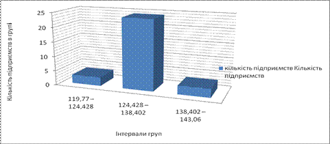 Відповідно до встановленої величини інтервалу складемо інтервальний ряд розподілу підприємств району за врожайністю картоплі (табл.2.1.3, рис. 2.1.2).