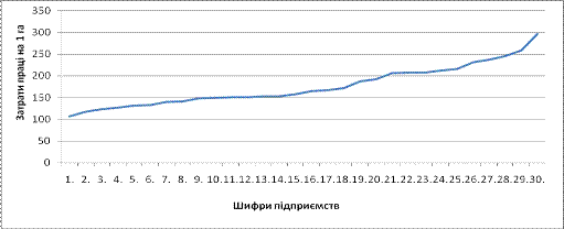 Як результативну ознаку для групувань виберемо урожайність урожайність картоплі, як факторні - слідуючі ознаки: розмір витрат на 1 га (грн), оплату праці на 1 люд.-год., внесення мінеральних добрив..