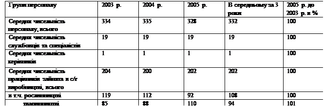 З Таблиці 1.4 ми бачимо, що середня чисельність персоналу за даний період не змінилась та в середньому складає 334 чоловік, середня чисельність керівників на протязі трьох років також не змінювалась. Середня чисельність працівників зайнята в с/г виробництві в середньому складає 200 чоловік