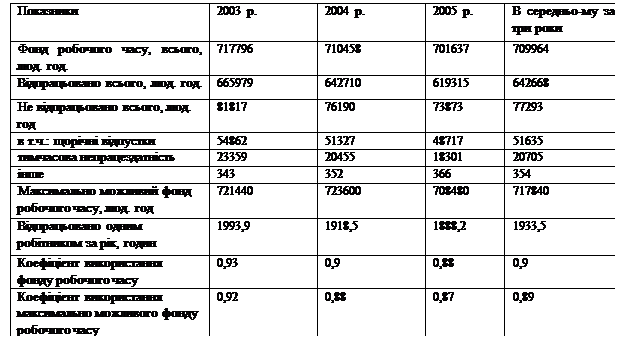Загальний фонд робочого часу в середньому за три роки склав 415816,3 люд. год. та збільшився на 1,3%. Максимально можливий фонд робочого часу в середньому склав 426960 люд. год. Коефіцієнт використання фонду робочого часу в середньому склав 0,89, а коефіцієнт використання максимально можливого фонду робочого часу – 1,03%.