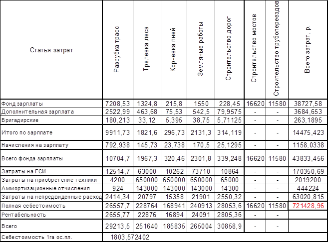 | Наименование применяемой техники | Количество единиц | Стоимость единицы, р. | Общая стоимость, р. | Общая площадь корчёвки, м2 | Комплексная норма в смену, м2 | Общий фонд зарплаты, р. | Общее количество ГСМ, л | Стоимость 1л ГСМ, р. | Общие затраты на ГСМ, р. | Всего затрат, р. |