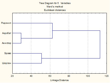 Кластерный анализ порядковых концентраций 5 фунгицидов, сдерживающих рост различных изолятов P . infestans выявил довольно высокое сходство по эффективности ограниченно системных фунгицидов Акробат и Амистар, а также контактных фунгицидов Браво и Ширлан (рис. 2).