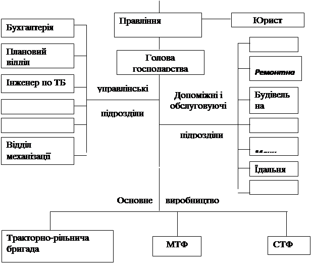 Як бачимо з наведеного рисунку в основному виробництві є один виробничий підрозділ в рослинництві і два в тваринництві. Є необхідні управлінські, обслуговуючі і допоміжні підрозділи, які забезпечують роботу основного виробництва.