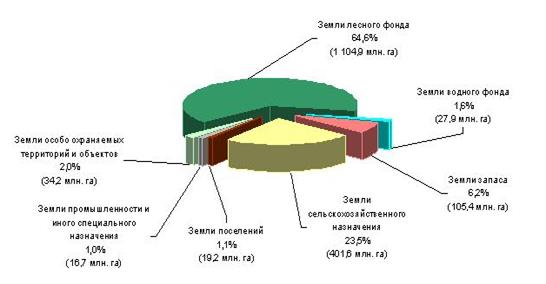 В компетенции государства как суверена находятся все земли в пределах Российской Федерации независимо от форм собственности, образующие земельный фонд Российской Федерации, который, по данным статистического наблюдения, осуществляемого Роснедвижимостью, составляет 1709,8 млн. га.
