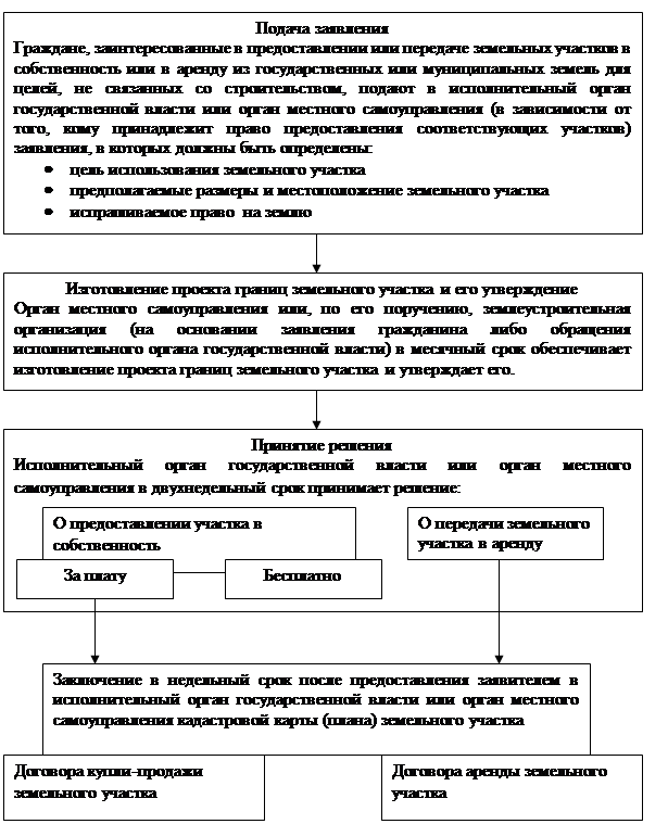 Порядок возникновения прав на землю определяется главой V ЗК РФ. Согласно ст. 28 ЗК РФ, земельные участки из земель, находящихся в государственной или муниципальной собственности, предоставляются гражданам и юридическим лицам в собственность или в аренду, а также предоставляются юридическим лицам в постоянное (бессрочное) пользование и гражданам и юридическим лицам в безвозмездное срочное пользование.