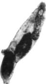 Стадии развития Fasciota hepatica : а) мирацидий; b) взрослая редия. содержащая церкарии; d) инкапсулированная метацеркария;.