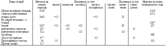 Общая площадь землепользования хозяйства на конец 2009 года составляла 3139 га, из них пашни 1937 га, сенокосы 242 га, пастбища 312 га. Всего сельскохозяйственных угодий 2491 га. Распределение площадей по земельным угодьям приведено в таблице 1.