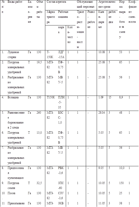 Требуемое количество навесных и прицепных машин и орудий определяется путем умножения числа агрегатов на количество машин в агрегате, а потребность в рабочей силе – произведением числа агрегатов на количество рабочих, обслуживающих один агрегат. Количество навесных орудий равно 1, и 1 тракторист.