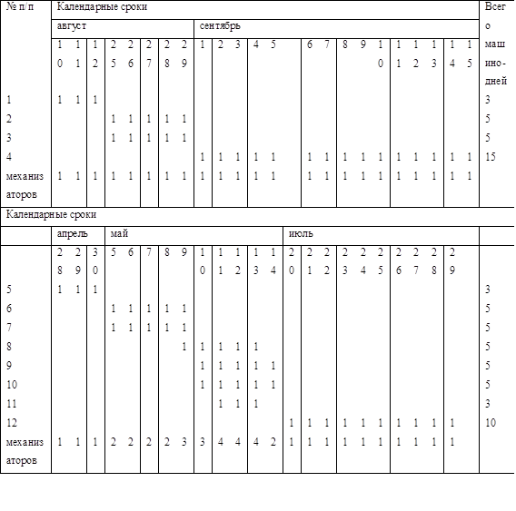 По данным таблицы 3.3.2 видна ежедневная потребность в тракторах, сельскохозяйственных машинах и орудиях, машинистах-трактористах, вспомогательных работниках. Такая сводная таблица значительно упрощает организацию производства продукции на предприятии.
