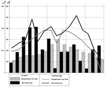| Месяца | Декады | Температура воздуха, оС | Осадки, мм | ||||