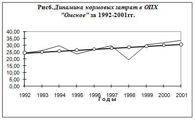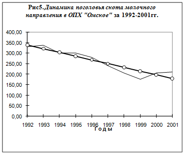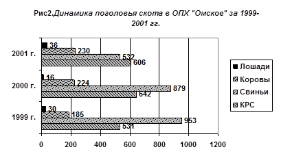 Анализ социально-экономического и финансового положения ОПХ "Омское" показывает, что взаимосвязь между численностью и продуктивностью крупного рогатого скота молочного направления является слабой и обратной. За последние десять лет в хозяйстве наблюдается рост продуктивности КРС, что объясняется улучшением кормовой базы, которая оказывает на неё прямое воздействие, так как важным фактором повышения продуктивности животных является их сбалансированное кормление, когда в рационе имеются все питательные вещества, необходимые организму животного в соответствии с их продуктивностью и их физиологическим состоянием. За 1999-2001 гг. сокращение поголовья скота произошло в основном за счёт резкого уменьшения численности свиней.