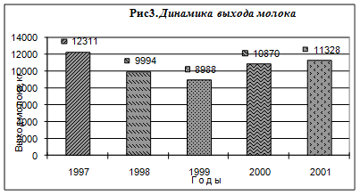 Таким образом, средний выход молока в ОПХ "Омское" составил 10698,2 кг. Причем за 1997-2001 гг. наблюдается снижение уровня выхода молока в 2001 году по сравнению с 1997 годом на 245,8 кг., то есть на 2,1%.