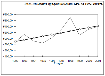 Таким образом, численность КРС по первому хозяйству в 2001 году по сравнению с предыдущим годом увеличилась на 3,3%, что в абсолютных показателях составило 20 усл. гол., а продуктивность уменьшилась на 9,0% или на 443 кг. молока. Во втором хозяйстве в отчётном году по сравнению с 1999 годом численность КРС сократилась на 2,4% (5 усл. гол.), а продуктивность уменьшилась на 1,8%, что в абсолютных показателях составило 92 кг. молока.