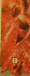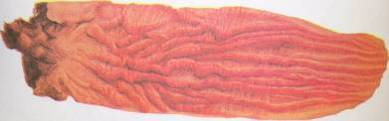 При остром септическом колибактериозе картина сепсиса. Септический процесс проявляется в увеличении и полнокровии селезенки, кровоизлияниях на серозных покровах, развитии перитонита, полиартрита. селезенка в одних случаях может быть увеличена незначительно (тупые края, полнокровна на разрезе, капсула напряжена), а в других она превышает размеры нормальной в 1,5-2 раза. В паренхиматозных органах развиваются сосудистые рас-ва, дистрофические и воспалительные процессы. В грудной полости иногда может быть серозно-фибринозный плеврит, а в легких - острая серозно-геморрагическая пневмония. |