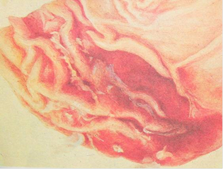 Протекает сверхостро, остро, подостро или хронически. При сверхостром течении инфекции наблюдают множественные точечные и мелкопятнистые кровоизлияния на слизистой оболочке тонкого кишечника, реже сычуга, на брыжейке, брюшине, под эпи - и эндокардом. Отмечают также острую гиперемию слизистых оболочек носовой полости, гортани, трахеи, сильную гиперемию и серозный отек легких. При остром течении трупное окоченение выражено слабо, наблюдают картину геморрагического диатеза, а также изменения, свойственные сепсису. Кровь в сосудах несвернувшаяся, маркая, с признаками гемолиза. Подкожная клетчатка и склера глаз имеют желтоватый оттенок. В подкожной и субсерозной клетчатке часто обнаруживают студенистые инфильтраты |