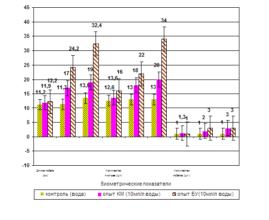 Через две недели после первой обработки и в дальнейшем, проводили измерения растений (по 150 на каждый вариант) по следующим показателям: длина побега, количество листьев на одном растении, длина листьев, количество дополнительных побегов.