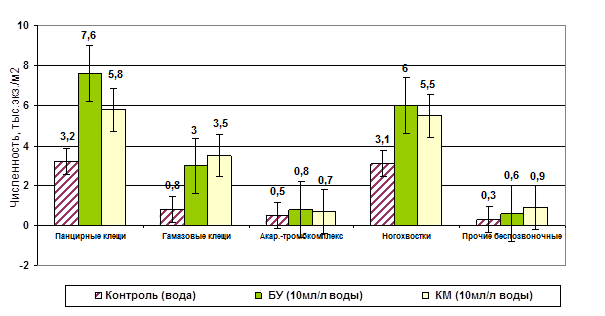 3. В модельных, полевых и производственных опытах показано, что внесение биологических активизаторов почвенного плодородия в пахотный горизонт чернозема обыкновенного ведет к улучшению условий существования большинства групп почвенных микроартропод и к направленной перестройке структуры их населения, что способствует повышению биологической активности почв.