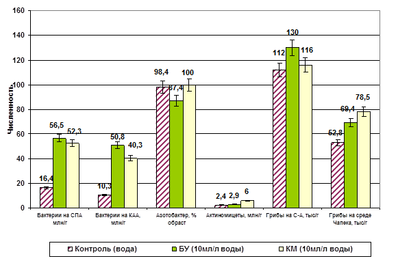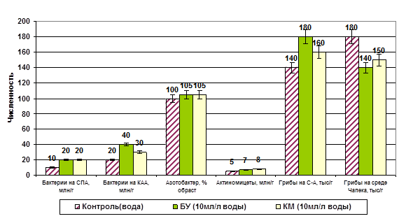 4. Использование биологических активизаторов почвенного плодородия под сельскохозяйственными культурами на богаре и в закрытом грунте, под цветочными культурами, многолетними травами активизирует микробиологические процессы в почве агроценозов (в среднем в 1,5 раза увеличивается численность бактерий, использующих минеральный и органический азот, в 1,3 раза микроскопических грибов, использующих органический азот). Установлена нейтральная реакция актиномицетов и азотфиксирующих бактерий р. Azotobacter на внесение активизаторов в агроценозах и снижение численности микроскопических грибов использующих минеральный азот по сравнению с контролем.