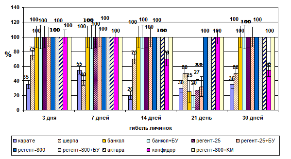При подсчете количества личинок на учетных кустах после применения препаратов учитывали только число живых питающихся личинок разного возраста по размерам: I-го возраста (длина тела около 2 мм), II-го (3-5 мм), III-го (6-10 мм) и IV-го (11-15 мм), а также количество живых жуков (имаго) и кладок.