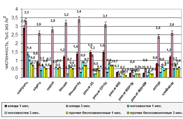 Для учета численности микроартропод почвенные пробы брали металлической рамкой объемом 125 см3 в 15-кратной повторности до глубины 10 см через 1 и 3 месяца после обработки пестицидами. В качестве контроля образцы почвы отбирали с необработанных участков картофельных полей. Экстракцию микроартропод проводили по методике Балога (1958) без электрического обогрева в течение 7 дней. Разбивку на группы и подсчет проводили под бинокуляром МБС-1. Для определения видового состава ногохвосток, панцирных и гамазовых клещей делали постоянные препараты в жидкости Фора-Берлезе (Palissa, 1964).