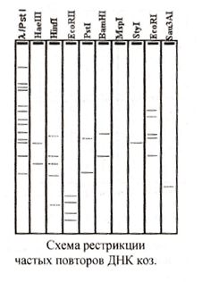Дополнения: это дополнение касается не только ПДРФ метода, но относится и к последующим методам, и к полиморфизму электрофоретической подвижности белков, и к группам крови. На самом деле оно вообще много к чему относится. Попробую пояснить как раз на примере белков. Существует прямой способ определения аллелизма, т.е. сам фермент, разгоняемый на электрофорезе, имеет несколько аллельных вариантов подвижности и активности. А существует косвенный метод определения аллелизма по подвижности белков: например миоглобин имеет два аллельных варианта и различается по длине, а активность и все остальные свойства у них одинаковые, но его аллельные варианты сцеплены с аллельными вариантами какого-нибудь пепсина. Следовательно, разгоняя миоглобин, мы можем делать заключения о аллелизме этого пепсина! Такой же непрямой принцип маркирования мы видим в ПДРФ. В процессе мутаций могут либо образовываться новые сайты рестрикции, либо пропадать, а ещё могут дублироваться уже существующие. Эти сайты наследуются по законам Менделя, потому также могут называться аллелями. Необходимо, сначала, статистически установить, с какими другими аллельными признаками сцеплены сайты рестрикции, а потом, на основании результатов электрофореза, можно говорить об аллелизме какого-то гена. Для того чтобы это установить, нам необходимо большое количество проб геномной ДНК, выделенной у многих животных. Также необходимо знать, как между собой различаются аллели исследуемого признака, и какие животные обладают какой аллелью. Теперь мы «режем» наши пробы ДНК разными ферментами и сверяем продукты их электрофоретического разделения по длине. Для наглядности я решил привести электрофоретическое разделение, рестрикционных фрагментов ДНК коз. Сверху приведены названия рестриктаз, которыми гидролизовали пробы. Картинка из брошюры Селекция XXI века: использование ДНК-технологий.