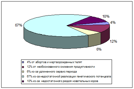 8. Из данных "Анализа упущенного дохода", который в хозяйстве подсчитывается по программе "Плинор" - АРМ "СЕЛЭКС" мы видим, что, хозяйство недополучило значительную сумму (10644073 тенге). Наибольший удельный вес в структуре упущенного дохода занимает статья "Нереализованный генетический потенциал" - 67%. Таким образом, если правильно подходить к вопросам реализации генетического потенциала молочного скота, т.е. правильно кормить животных, для воспроизводства стада использовать оцененных быков - производителей, то хозяйство получило бы прибыли на 7150298 тенге больше.