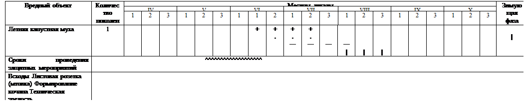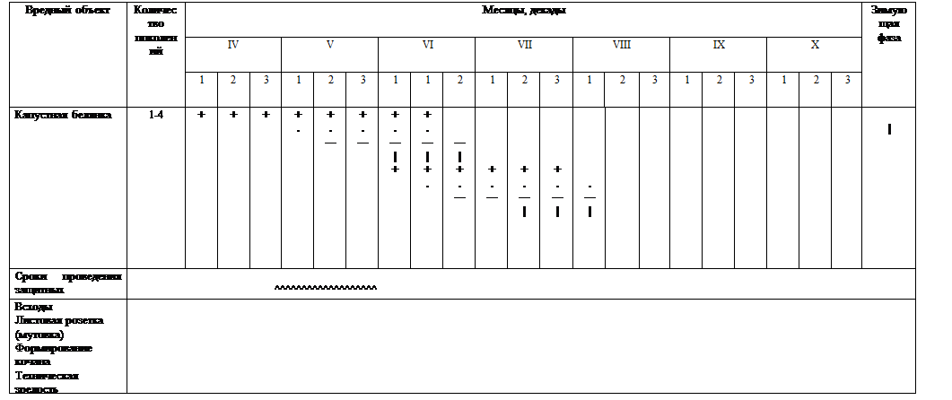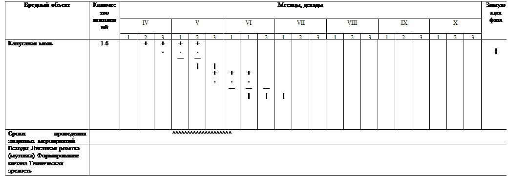 Из таблицы видно, что у капустной моли наибольший вред оказывают личинки. Фазы, которым вредит капустная белянка — листовая розетка, формирование кочана. Следовательно. защитные мероприятия необходимо проводить в фазы листовой розетки и формирования кочана против кладок яиц и гусениц II поколения.