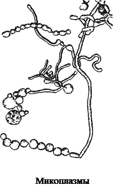 Размножение микоплазм происходит почкованием или бинарным делением. В отличие от бактерий, микоплазмы не имеют клеточной стенки, их клетка отделена только трехслойной мембраной. Вследствие этого микоплазмы не имеют определенной формы, она может варьировать от округлой и овальной до вытянутой, гантелевидной в зависимости от внешних условий (рис. 20). Немногочисленные виды имеют спиральную форму. Вытягиваясь в тонкие нити, микоплазмы способны проникать через бактериальные фильтры, в результате чего до середины 20 века болезни, вызываемые ими (микоплазмозы), отождествляли с вирозами.