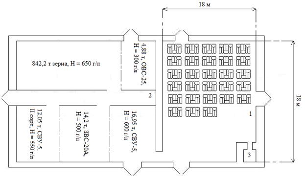1 – секция хранения семенного материала; 2 – секции хранения продовольственного зерна и отходов; 3 – помещение для хранения тары.
