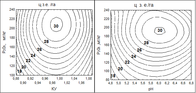 1. Установлено, что в целом по Курской области на продуктивность пашни оказывает влияние обеспеченность почв фосфором (45-55%), вторым по значимости фактором является кислотность почв (24-41%), а в северо-западном районе серых лесных почв возрастает роль гумуса (19-23%), что связано с азотным режимом, и кислотности почв (31-40%). Оптимальные значения показателей по кислотности почв и содержанию подвижного фосфора составляют соответственно 6,0 ед.рН и 200 мг/100г. Удельный прирост продуктивности при повышении рН на единицу в северо-западных районах (на серых лесных почвах) в 2 раза выше, чем в среднем по территории области (15 и 7,6 ц з.е./га на ед. рН) .