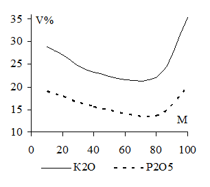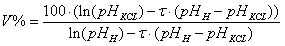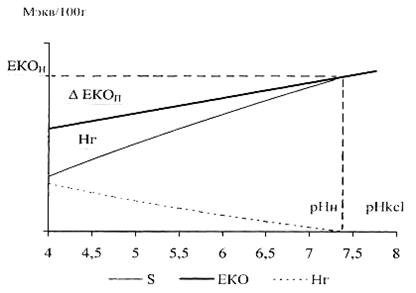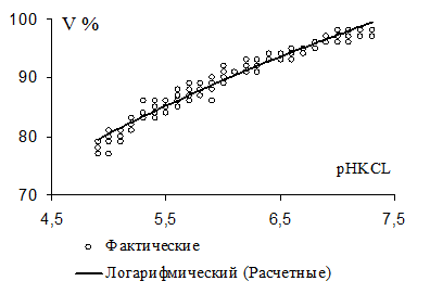 Состоянию насыщения ППК соответствует определенное значение рНKCL , как точки условного насыщения (рНН ), близкое по величине 7.4 ед., при котором однократно определяемая гидролитическая кислотность (рН-зависимая) принимает минимальные значения. Фактические величины ЕКОП , Нг, S пропорциональны величине (М) и логарифмическим значениям рНKCL . Абсолютные изменения ∆Нг, ∆V% при изменении реакции среды пропорциональны величине (М) и логарифму относительного изменения рНKCL .