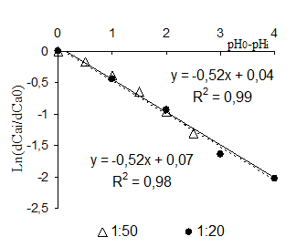 Для обоснования процесса использована модель релаксации системы «ППК-почвенный раствор», которая выводится из равновесного (исходного, соответствующего кислотно-основному статусу) состояния при достижении почвой максимума нейтрализации (рН0 → рНmax ), на которую рассчитана применяемая доза извести. Длительность восстановления реакции среды определяется необходимым количеством циклов (t, лет) промывания почвы, обеспечивающих равенство общего снижения обменно- поглощенных оснований, предшествующим их изменениям от известковых доз.