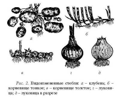 У некоторых растений вегетативные органы представлены клубнями (рис. 2, а) — сильно укороченными, шаровидно утолщенными корневищами. Клубни могут быть надземными и подземными.