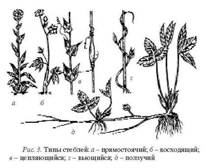 Различают прямостоячие, (наперстянка, полынь обыкновенная), приподнимающиеся, или восходящие (толокнянка, чабрец), цепляющиеся (горошек мышиный, чина луговая), ползучие (плаун булавовидный, лютик ползучий) и вьющиеся (лимонник китайский) стебли (рис. 3). Растения с вьющимися стеблями называют лианами. Растения с цепляющимися стеблями отличаются от вьющихся тем, что не обвивают другие стебли, а цепляются за соседние растения, стены и другие предметы при помощи специальных усиков, шипиков, прицепок.