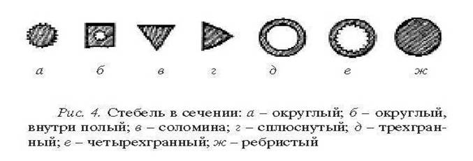 В сечении стебли (рис. 4) бывают округлыми (кукуруза, ромашка и др.), округлыми, полыми внутри вследствие разрушения сердцевины (конский щавель, лютик). Если же сердцевина не образуется, как у злаков (рожь, пшеница) стебель называют соломиной. Трехгранный стебель — у осоки, ландыша, четырехгранный — у большинства растений семейства губоцветных, ребристый — у валерианы, хвоща, сплюснутый стебель имеет аир.