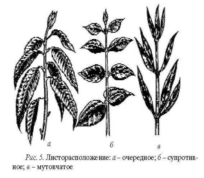 Места прикрепления листьев называют узлами, а расстояния между узлами — междоузлиями. Если каждый узел несет по одному листу — это очередное расположение листьев, по два (обычно друг против друга) — супротивное расположение, а если в одном узле три и более листьев, то такое расположение называют мутовчатым (рис. 5).