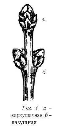 Почки обычно расположены на стебле и представляют собой видоизмененные укороченные побеги. Они могут быть верхушечными, пазушными (рис. 6). Почки, из которых образуются листья, называются вегетативными или листовыми; те, из которых образуются цветки, — генеративными или цветочными.
