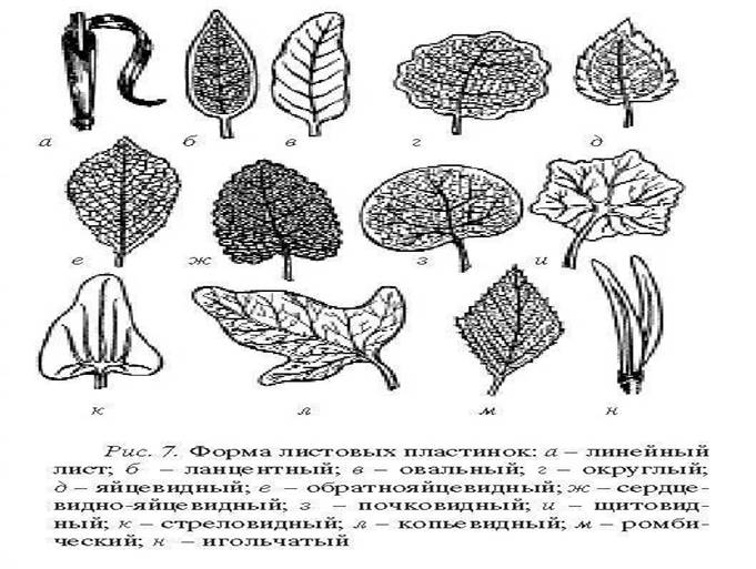 По форме простые листья делятся на линейные, ланцетные, овальные, яйцевидные, обратнояйцевидные, сердцевидно-яйцевидные, почковидные, щитовидные, округлые, ромбические, стреловидные, копьевидные, игольчатые (рис. 7).