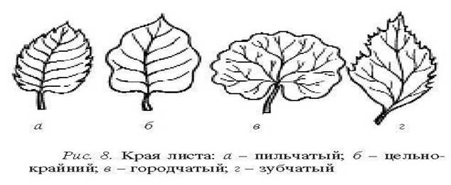 Края листовой пластинки бывают зубчатые и без зубцов. Если край листа цельный, без надрезов, лист называется цельнокрайним (ландыш) (рис. 8, б). Если пластинка разрезана на глубину не более четверти своей ширины, то такой лист называется пильчатым, зубчатым или городчатым (рис. 8, а, в, г). У зубчатого листа острые зубцы расположены перпендикулярно к краю (земляника), у пильчатого зубцы наклонены в сторону вершины (крапива), у городчатого край листа имеет не острые надрезы, а полукруглые, тупые (коровяк). Кроме того, выделяют выемчатые (мать-и-мачеха) и волнистые (вахта) листья. У ряда растений листья имеют глубокие надрезы и называются листьями с расчлененной листовой пластинкой (рис. 9). Листья делятся также на пальчатые и перистые, в свою